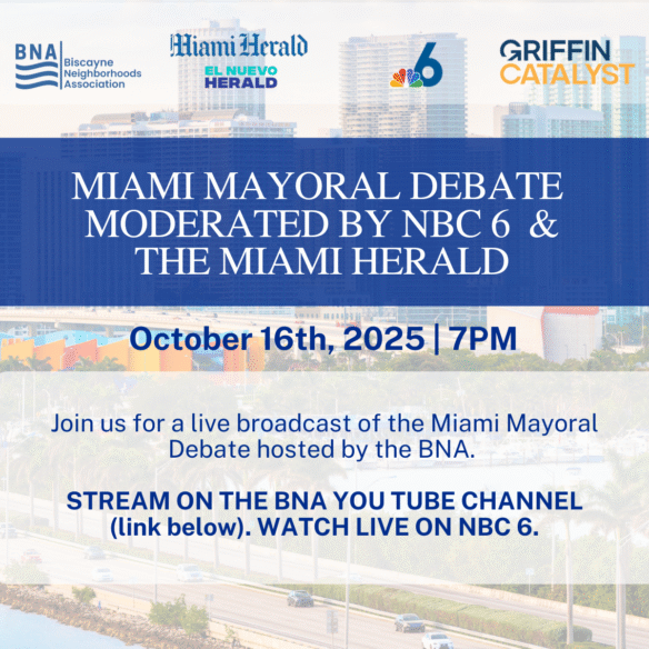 Join us this Thursday, October 16th at 7PM to watch the BNA Miami Mayoral Debate, featuring the leading 4 candidates for Mayor of Miami.