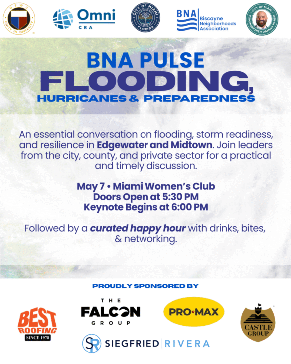 As flooding events become more frequent across Miami, understanding how to prepare, respond, and protect your property has never been more important. Join the Biscayne Neighborhoods Association for a timely and informative panel focused on flooding, hurricane preparedness, and community resilience.